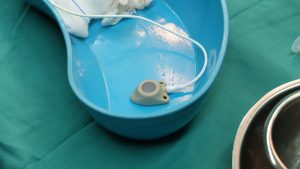 The PowerPort system is composed of two main parts: an injection port and the catheter. The device is surgically implanted under the skin where the injection port can be easily accessed through its raised center by insertion of a needle for delivery of the medication. The medication is carried from the port into the bloodstream through the catheter that is inserted into a blood vessel.